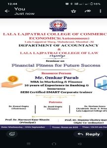 During the academic year 2024–25, Lala Lajpatrai College of Law organized a series of insightful guest lectures and workshops aimed at enriching students’ academic and practical knowledge. On 25th September 2024, a seminar on “Financial Fitness for Future Success” was held to promote financial literacy and investor awareness.. A series of guest lectures followed in the second term: on 4th January 2025, Dr. Chhaya Shah spoke on “Consumer Protection,” and on 6th January, Advocate Savitri Dhanesha addressed the importance of “Legal Language.” Advocate Namrata Maru delivered a lecture on “White Collar Crimes” on 8th February 2025, followed by a session on “Women Empowerment” by Advocate Shaili Mazoomdar on 8th March. On 10th March, Advocate Anshul Shah conducted a lecture on “Arbitration,” and the academic year concluded with a workshop on 18th March 2025 titled “SEBI Investor Awareness Program” led by Prof. Aiman Masood. These events offered students valuable insights into contemporary legal and financial topics, supporting both their academic growth and practical understanding.